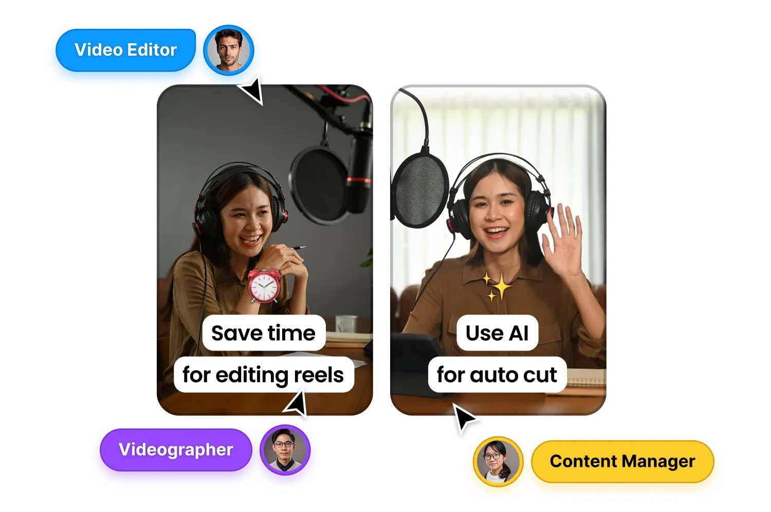 Work together seamlessly with shared folders, presets, and brand kits. Journalists, editors, and social managers can stay aligned and publish faster.
